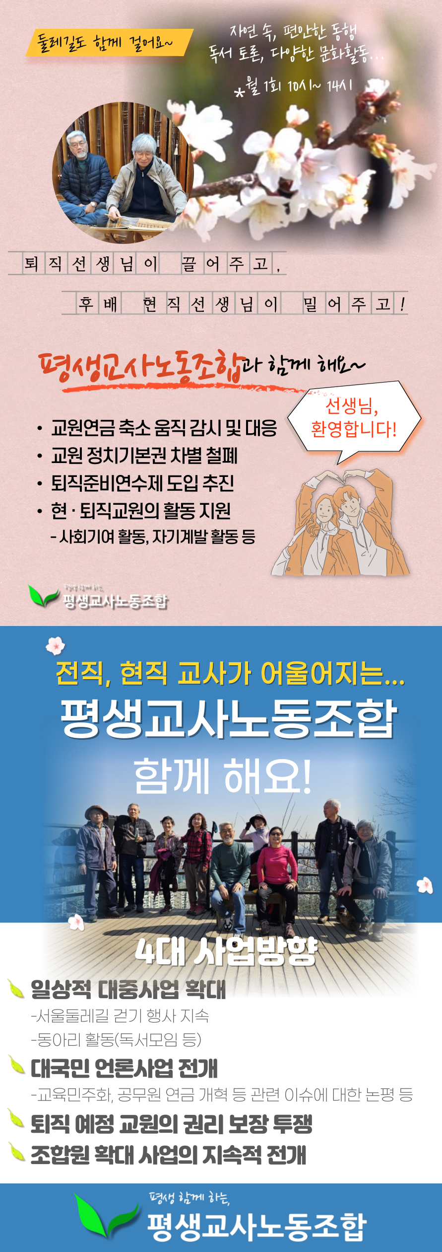 우리 평생교사노조는 퇴임교사가 주축이 되어 후배 현직교사들의 교육현장 개선에 적극 앞장서며, 교사의 시민기본권 확보와 복리 증진을 위해 일하겠습니다.